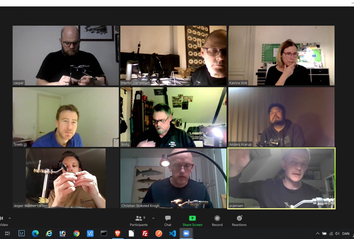 Almost every Wednesday for a very long time, I have been online tying flies with a bunch of Danes, simply turning on the camera in my laptop or phone and launching Zoom to join a small meeting. We have typically been 6-8-10 people who have been chatting and tying and having a really great time. The sessions last for a couple of hours, and although it’s not like meeting in the flesh, it’s certainly a good motivation for digging out some hooks and some thread and combining that with flash, fur and feathers. And it has also been a great way to make some new fly-tying friends.