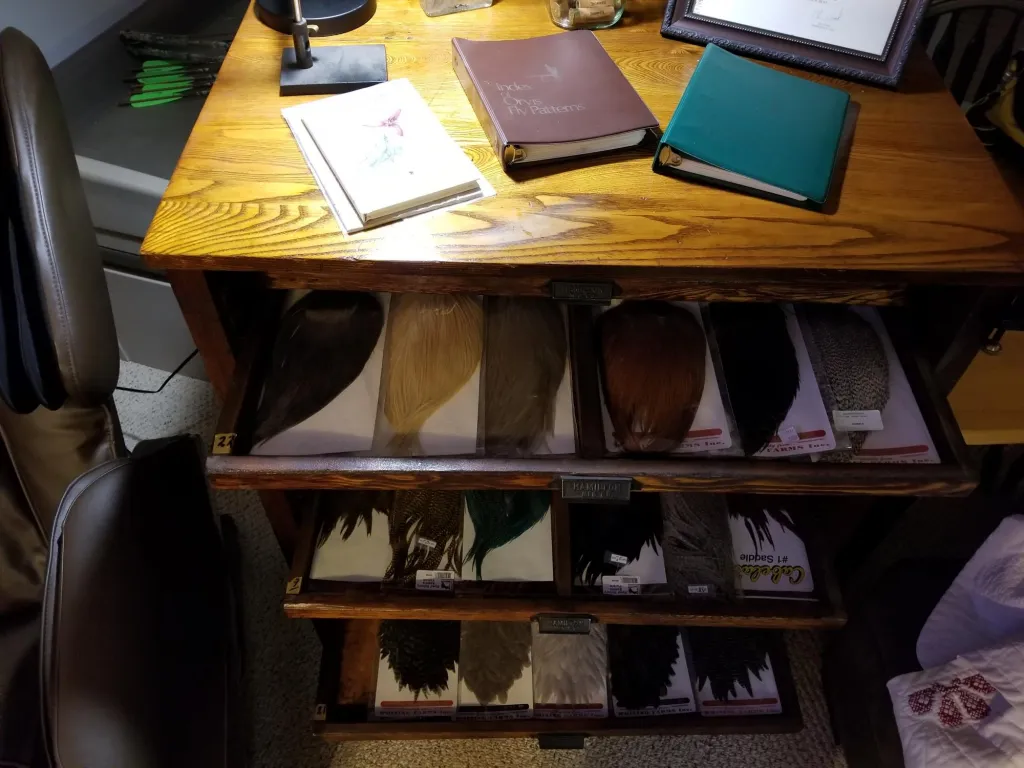 That's quite a setup you have there. I have a few questions for you, first, if you have ever been married, are you still married? Not many women would be so gracious to grant her husband the space, let alone the resources to invest so much into their sport/hobby. Also, I'm assuming this is primarily your tying space and not a museum? That is quite a collection of fly tying tools, materials, and fishing equipment that you have. I would pay money just to see it in person. And my final question is what is your favorite vise, bobbin, whip finishing tool, etc?