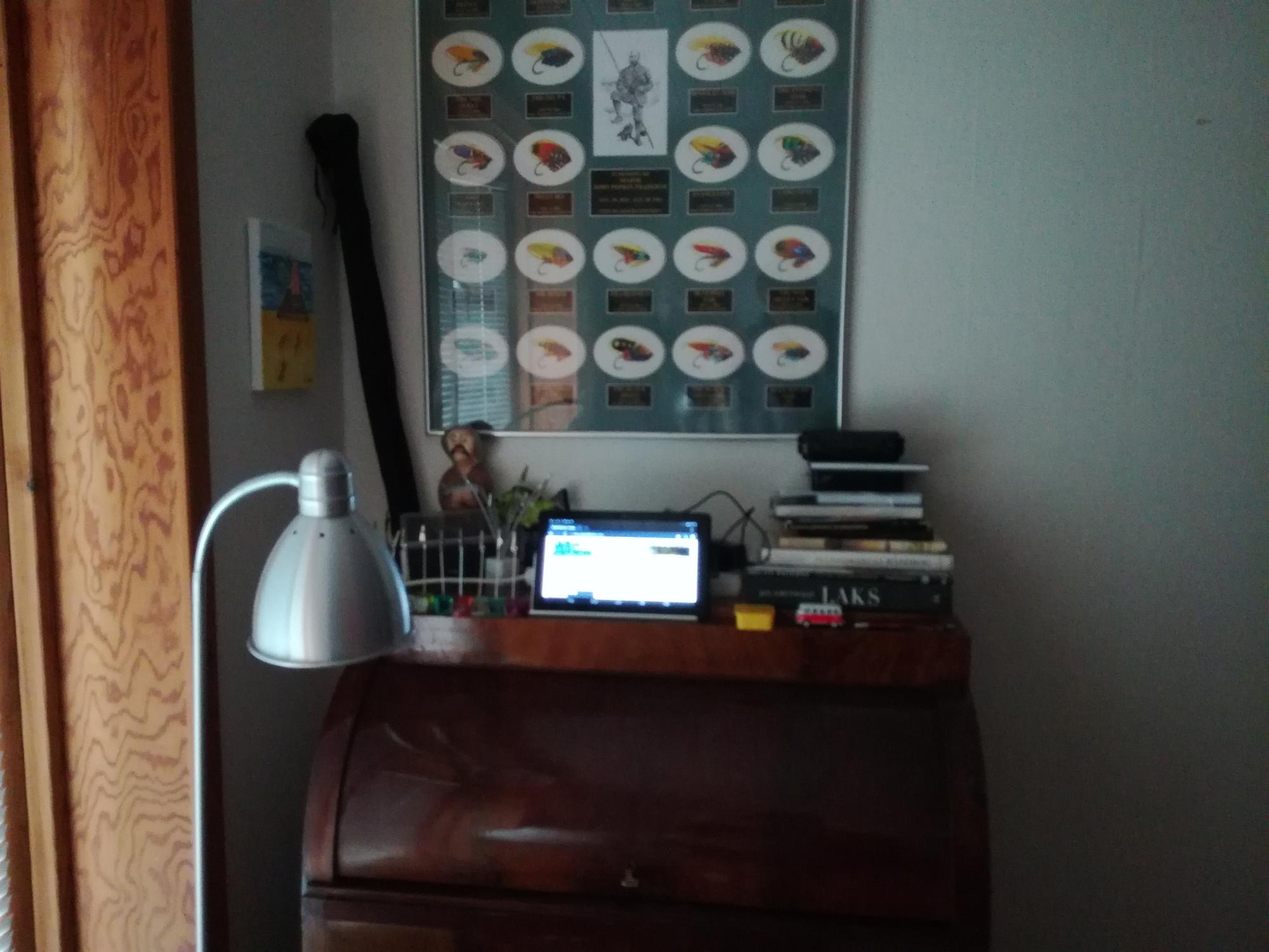 I tye in the bedroom, so I need a lid on my tying station to avoid feathers and hair all over the place. I used to tye on a regal copy but having to locate a size 18 hook, that was shot out of the vise and onto the bed made me buy my current vise. I found my roll top for a mere 300,- dkr.,the seller citing the tableplate being stuck, took a me exactly thirty seconds to make it unstuck, nice. The small drawers hold hooks, beads, eyes, thread and assorted odds and ends and I have one large drawer for hair and fur and another for feathers, leaving the last one for "miscellaneous