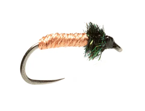 2. Tie in a strand of peacock herl, wind forward and tie in. Hold the thread tight and snap off the waste herl.