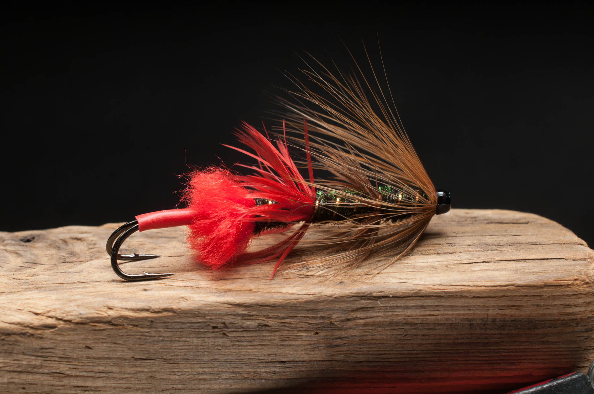 12. Tie in the red hackle stem first, curved side forward and wrap 3-4 times.