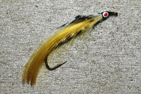Body 14 strands of thin silver tinsel twisted and wrapped + 5 black painted bands with red dots