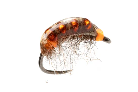 - Brush the dubbing down, fold the ribbon forward over the beads, tie in and remove the waste.