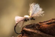1. Run on the thread, fold the ultra-dry yarn around the hook from underneath and secure with cross wraps a little way back from the hook eye. Add thread wraps around the fibres to form the wing post.