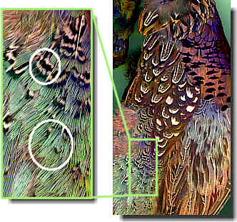 The feathers for Miss Ring are found on the lower back and rump of the skin between the wings. The large picture (right) shows most of a skin while the small picture shows where to look for the wings (upper small circle) and the false hackle feathers (lower, larger circle).
