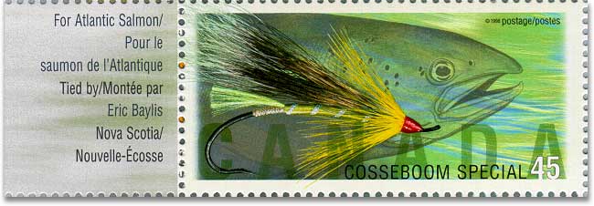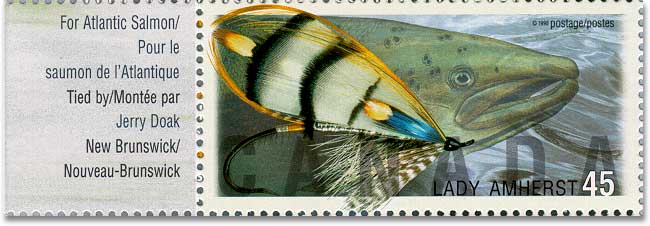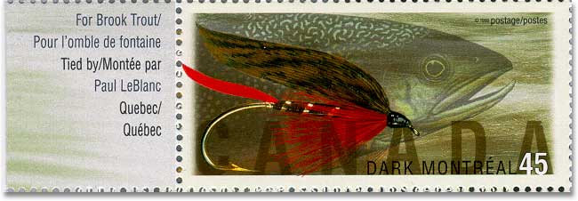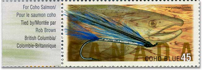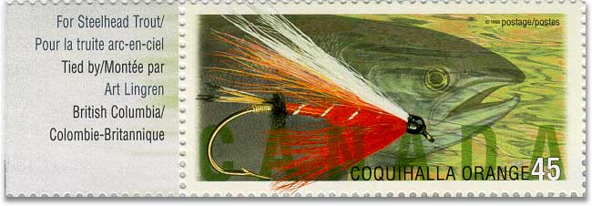 And then again... more flyfishing stamps earlier this year! Post Canada came out with a lovely series of 6 large stamps, worth 45 cents each. They feature wonderful creations such as the Cosseboom Special, the Coho Blue, the Dark Montreal, (formerly also known as the Canada Fly), the Steelhead Bee, the Coquihalla Orange and the Lady Amherst. What a charming girl with her silvery wings, giving me a wink with her Jungle Cock eyes: will you tie me, Maestro, pleeeeze.