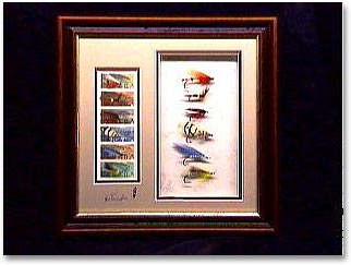 Subsequently, in 1991 - if internal memory serves me right - the United States Postal Service came out with a flyfishing stamp series, showing Lee's Royal Wulff, Stu's Apte Tarpon Fly, Kreh's Lefty's Deceiver, Don Gapen's Muddler Minnow, and a beautiful Jock Scott created by John Scott almost 150 years ago. And again in that same drawer, in that same attic, covered with a thin layer of that same dust, I found a few of those. My good friend and colleague, Marvin Nolte, presented me with a flyplate containing these stamps and the flies that he had tied. This plate is now on one of the walls of my den of inequity here. I am looking at the plate while writing this story. Beautiful flies that bar none.