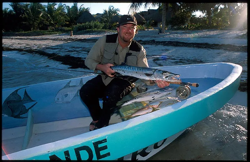 Nils caught a variety of fish trolling over the reef on deeper water. This barracuda was the grand prize, but he managed to get snappers and jacks too. The guide was rewarded the catch, which ended as local dinner.