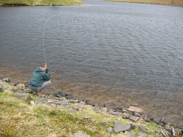 Paul with a fish on at a close-to-perfect spot for the wind drifted Diawl Bach. When a fish is hooked on the long leader you realise the advantage of a long shafted net.