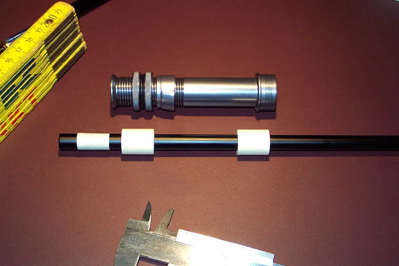 Blank with bushings prepared to accept the reel seat lying parallel to the blank.