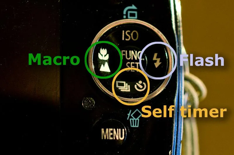 The essential controls on a small Canon camera: Macro, Flash and Self timer