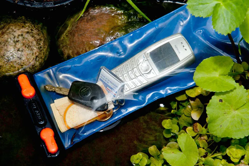 You can buy bags that seal 100% meant for fishing, diving, hunting and other rough outdoors activities. Such a bag will hold phone, car keys, money, ID-papers and other things that need protection, and can be worn fully exposed with no risk. This one is from AquaPac