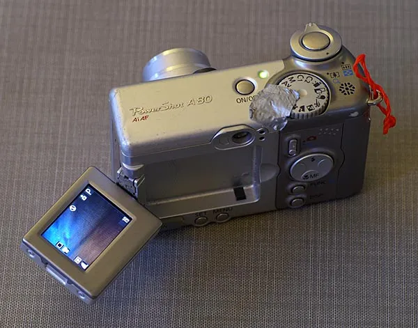 An LCD that flips out like this can be great for odd-angle shots, low shots and macro photography. The duct tape is to keep the dial from moving when I take the camera out of a pocket and the red string is for attaching it to a large retractor I have in my waders.