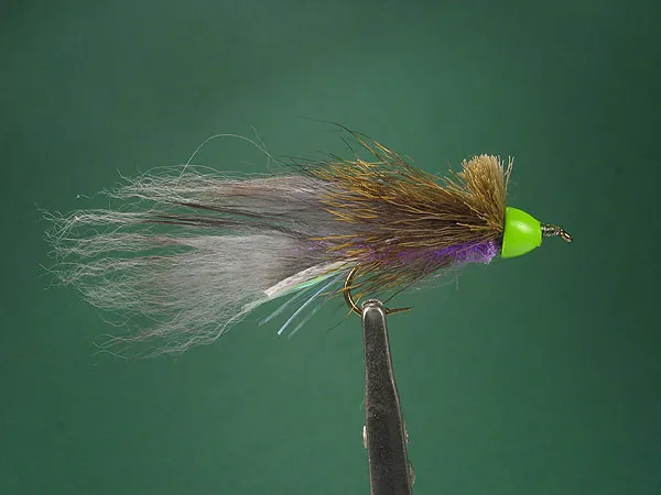 Natural Grey Zuddler with dark overwing, dubbed purple body, flash tail and hot green cone.