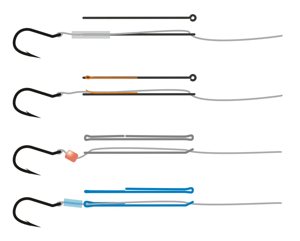 Ways of attaching a loose hook. In all cases, the tippet simply passes along the body of the fly and is threaded through the rear loop or tube. From the top: