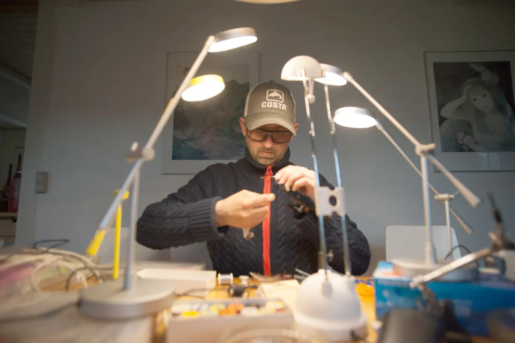 Niels Have does have poor eyesight and does really need a lot of light for tying. This is NOT his usual setup, though, but a setup of all the lamps at a group tying session. Most of these lamps are the cheap multi-LED lamps bought in the German Aldi supermarket.