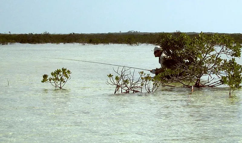 Dariusz lurking in the mangroves. Kneeling like this hides you well, and you can get considerably closer to the fish without them seeing you.
