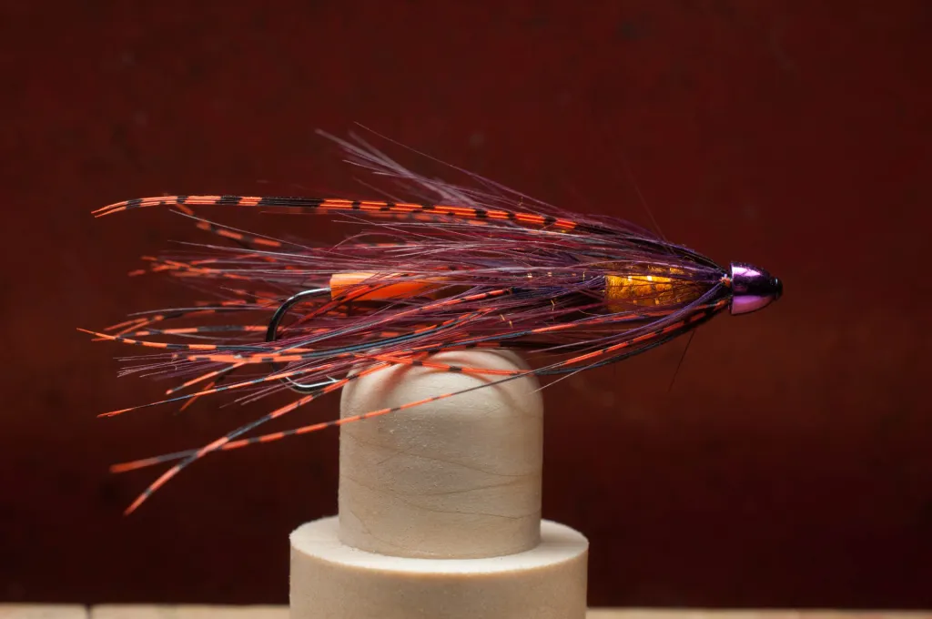 This gaudy tube fly feathers several hackle styles, most pronounced the colorful red one made as a false hackle from dyed Amherst tail feather barbs