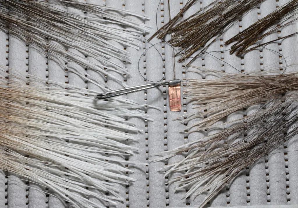 Here several colors and qualities of moose hair has been laid out together with the custom tool.