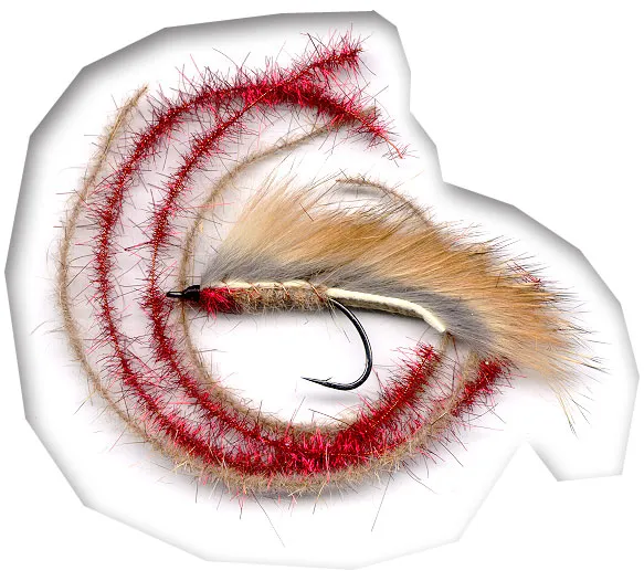 A Chicken or Pasta Fly on a bed of Siman brushes: dull tan squirrel ones and brighter red flash ones