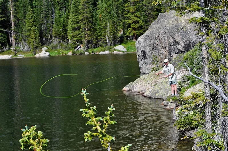 Shane Murphy lays out a perfect cast to cruising Colorado River Cutthroat in Lake Nanita, Rocky Mountain National Park.