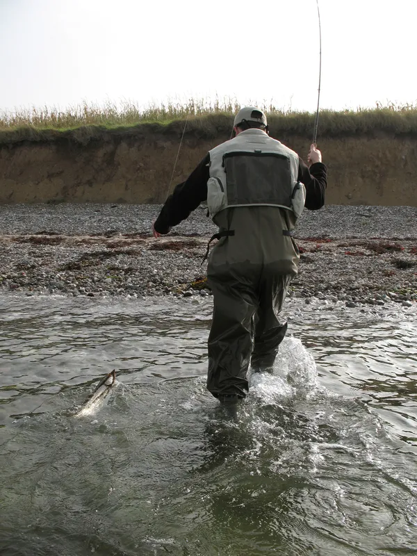 Vanuz demonstrates an easy way to land a trout - just pull it into the shallow water