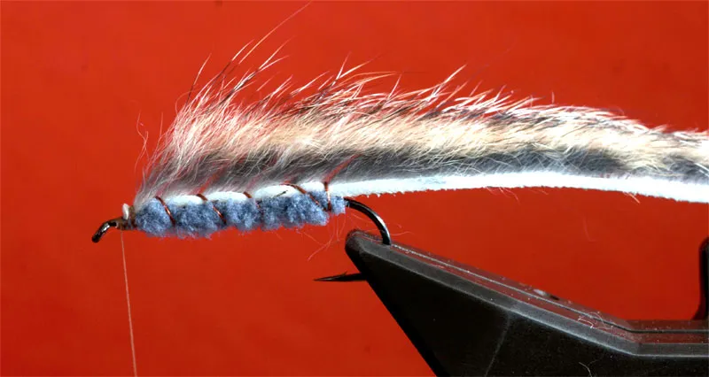 I have tied this zonker using a thick skinned zonker strip and a voluminous body to exaggerate the bump in front of the wing