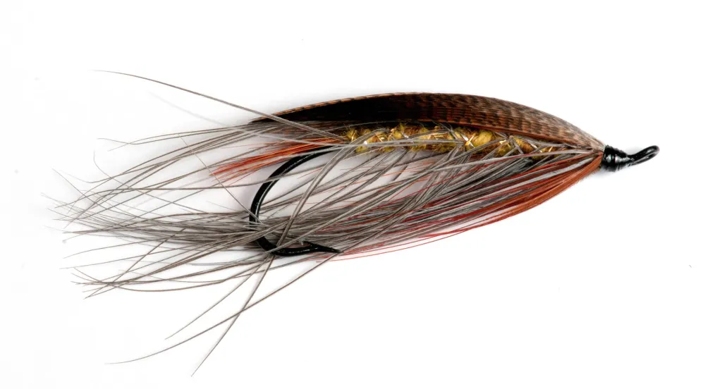 This Lady Caroline show the classic Spey hackle made from heron feathers that sweep down and behind the body