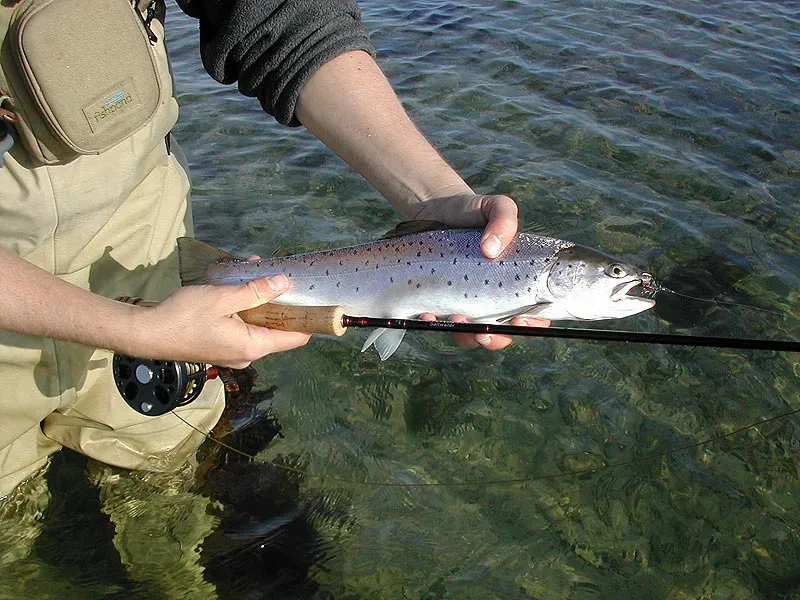A typical spring sea trout - silvery, somewhat slim, but very beautiful. This is not a big fish, but close to the average of the trout you will catch when fishing on the Danish coast.