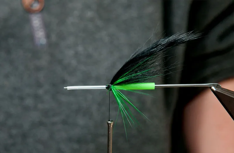 Tie in the zonker strip right in front of the hackle, keeping everything very compact. Notice how the strip "rides" on the underwing and hackle