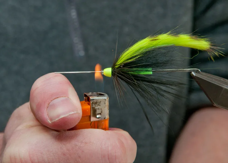 Melt a collar on the inner tube to secure the cone. Be careful not to scorch the hackle!