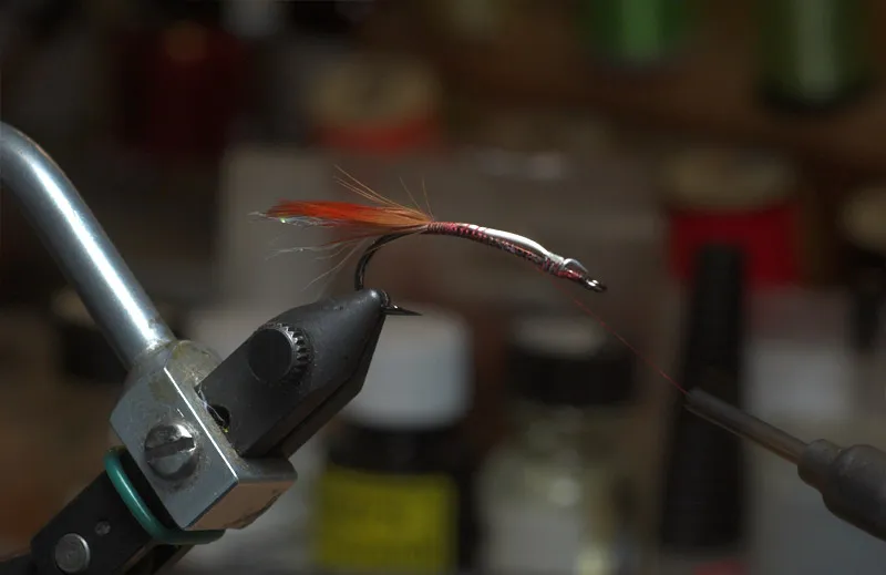 Pull the tail to its final position while the thread is still loose and continue the thread over the shaft of the feather