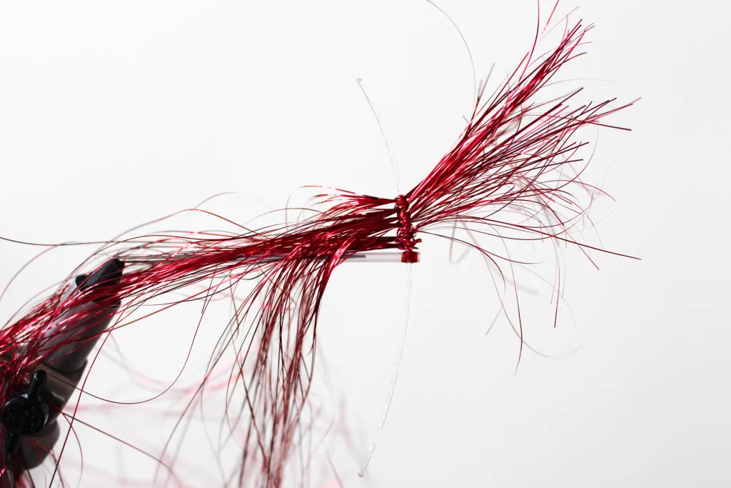 Add more bundles of flash, each knot sitting fairly close to the previous one, having the flash forming the "carpet" that has given the fly its name. The tags in front of the nylon arc are simply trimmed off with a pair of scissors.