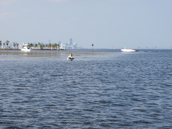 A patient angler waits for large bonefish to come close with the incoming tide. On the background is downtown Miami.