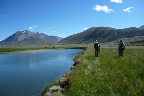 A very calm morning on a long pool on the Upper Ahuriri River in New Zealand. Spotting the trout on the drop-off was very easy from the high bank.