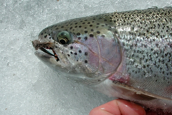 From the Ice. Taking 18"-24" Rainbow Trout just after break up while standing on the shelf ice. It made for trickey landings, but it was worth it. Taken on "Royal Muddler" of my own design.