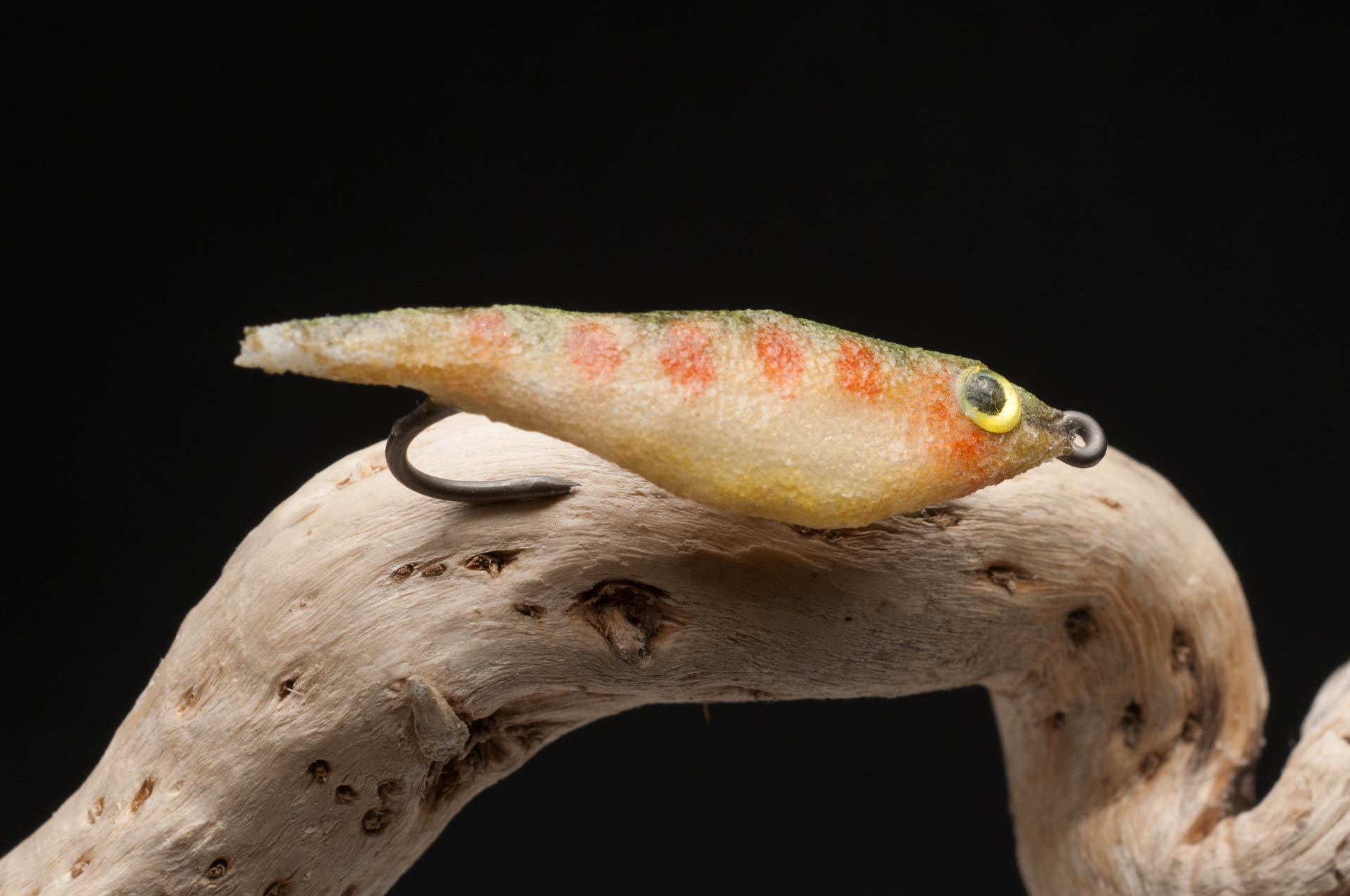 This fly was given to me by Welsh Paul Slaney during one of the fly shows we participated in together. As far as I know it's meant to be fished floating in lakes, probably imitating a dead fry floating in the surface. The material is painted foam.